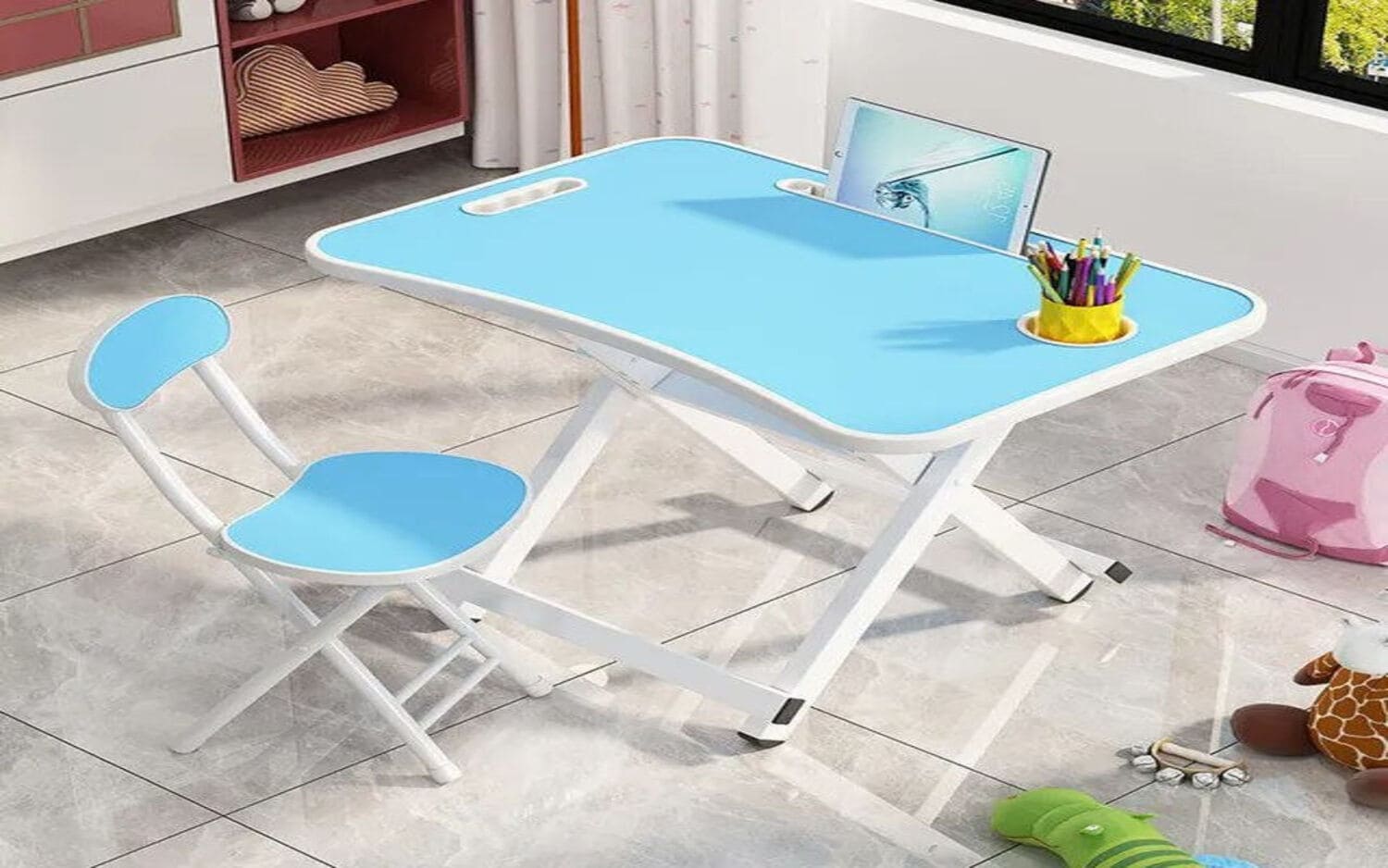 Acest set de mobilier colorat pentru copii este perfect pentru activitățile zilnice.