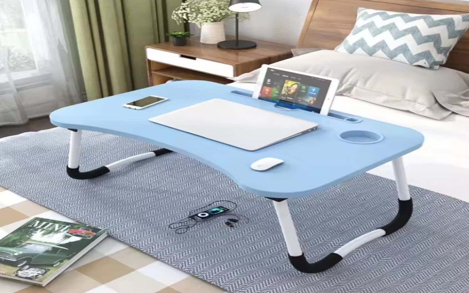 Masa de laptop pliabilă, ideală pentru utilizarea în pat sau pe canapea.